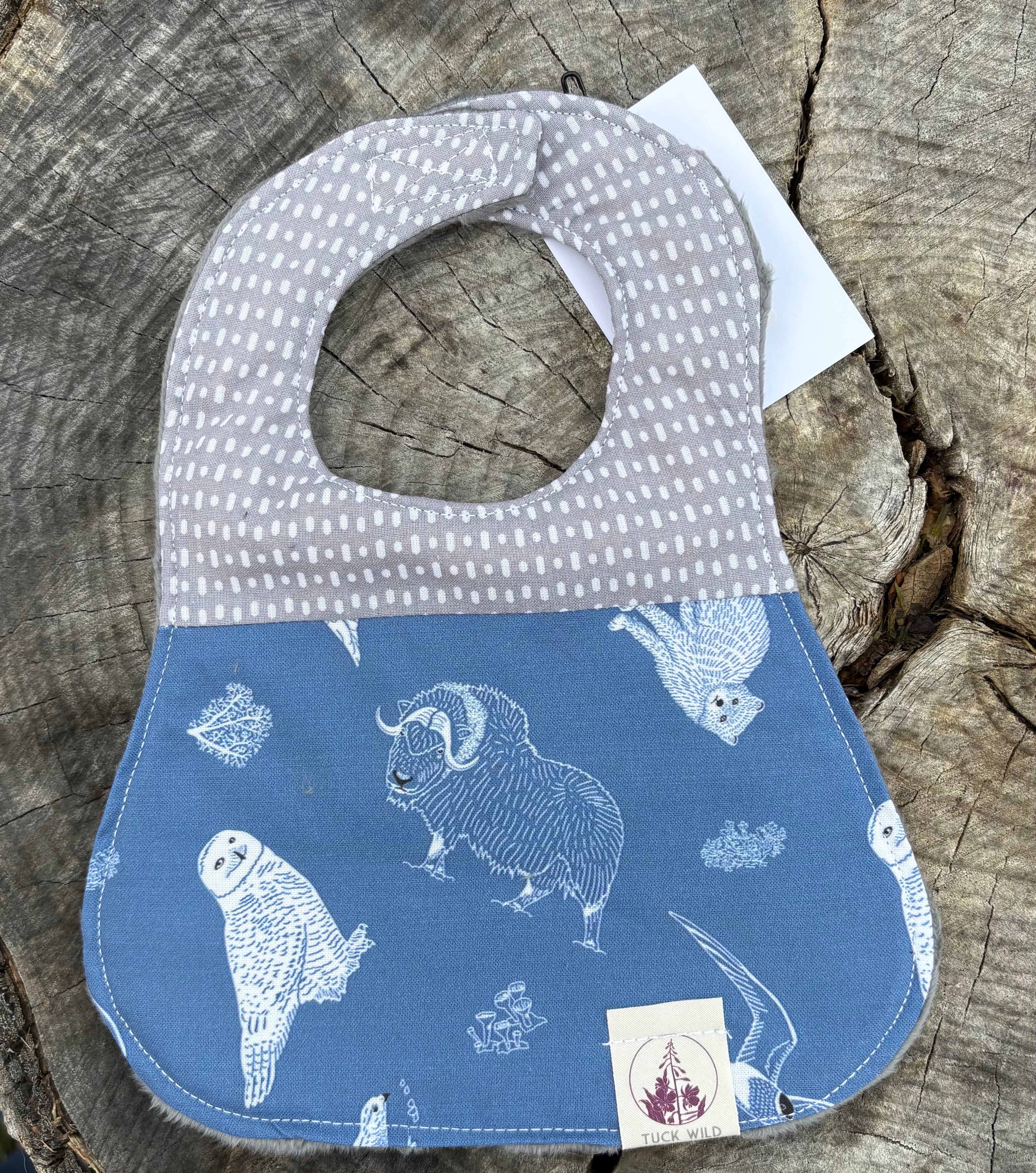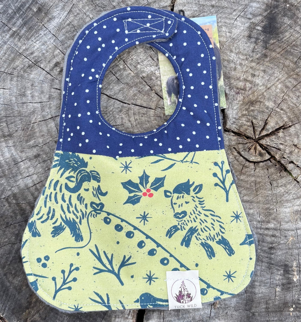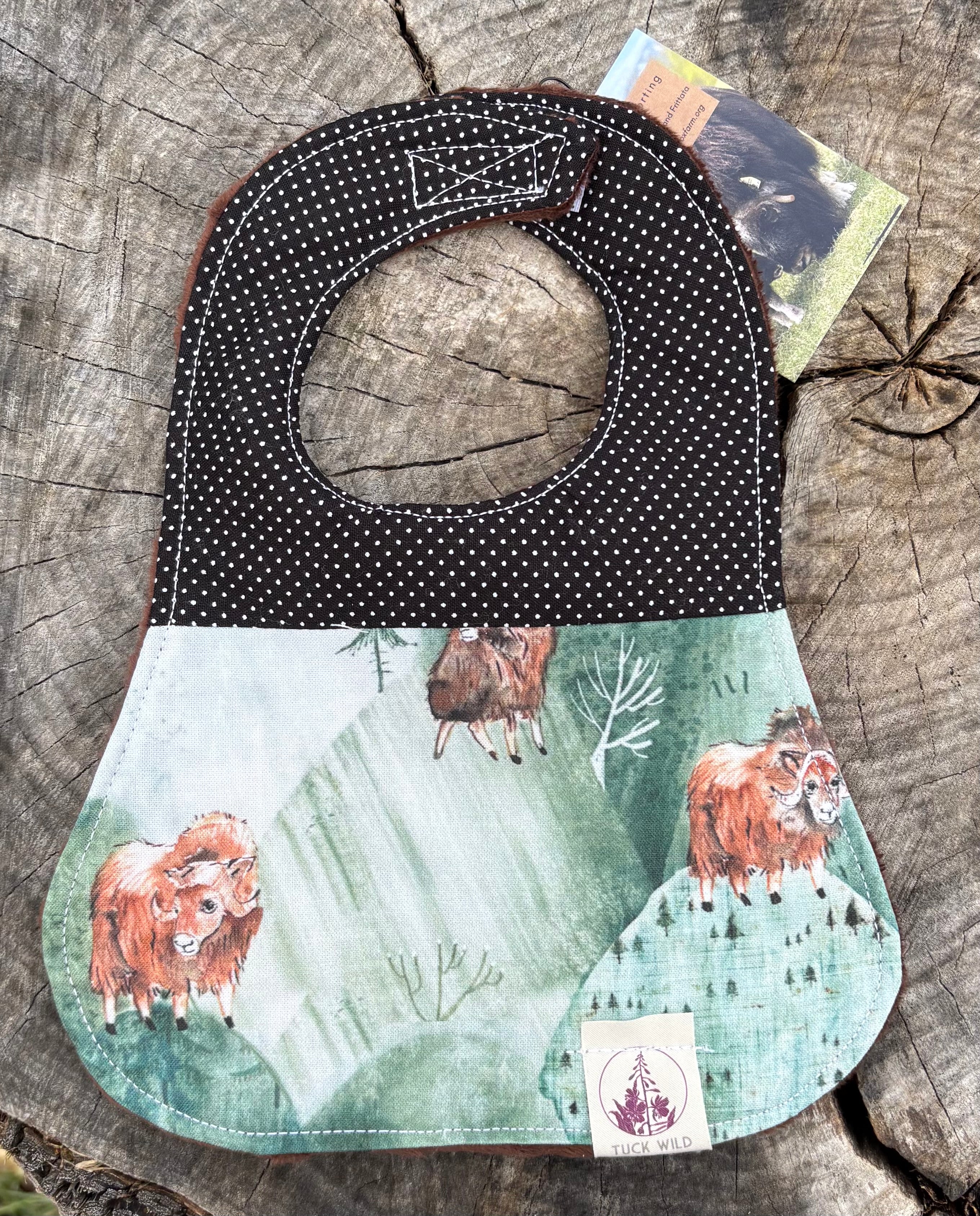 These three layer baby bibs are made in Alaska by Tuck Wild. They are three layers for oxtra absorbency and machine washable for easy clean up. The neck clasp is velcro for an adjustable fit.