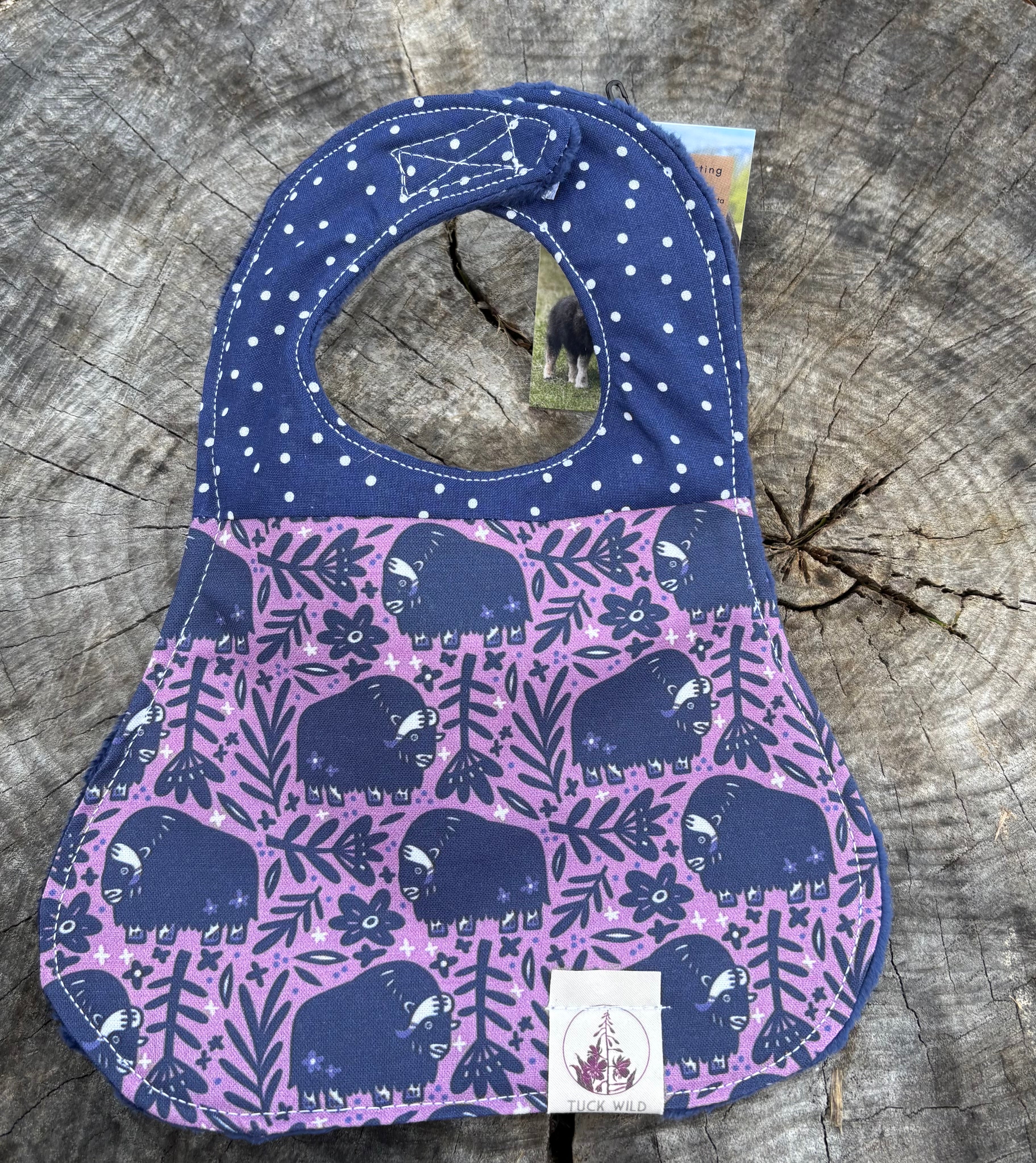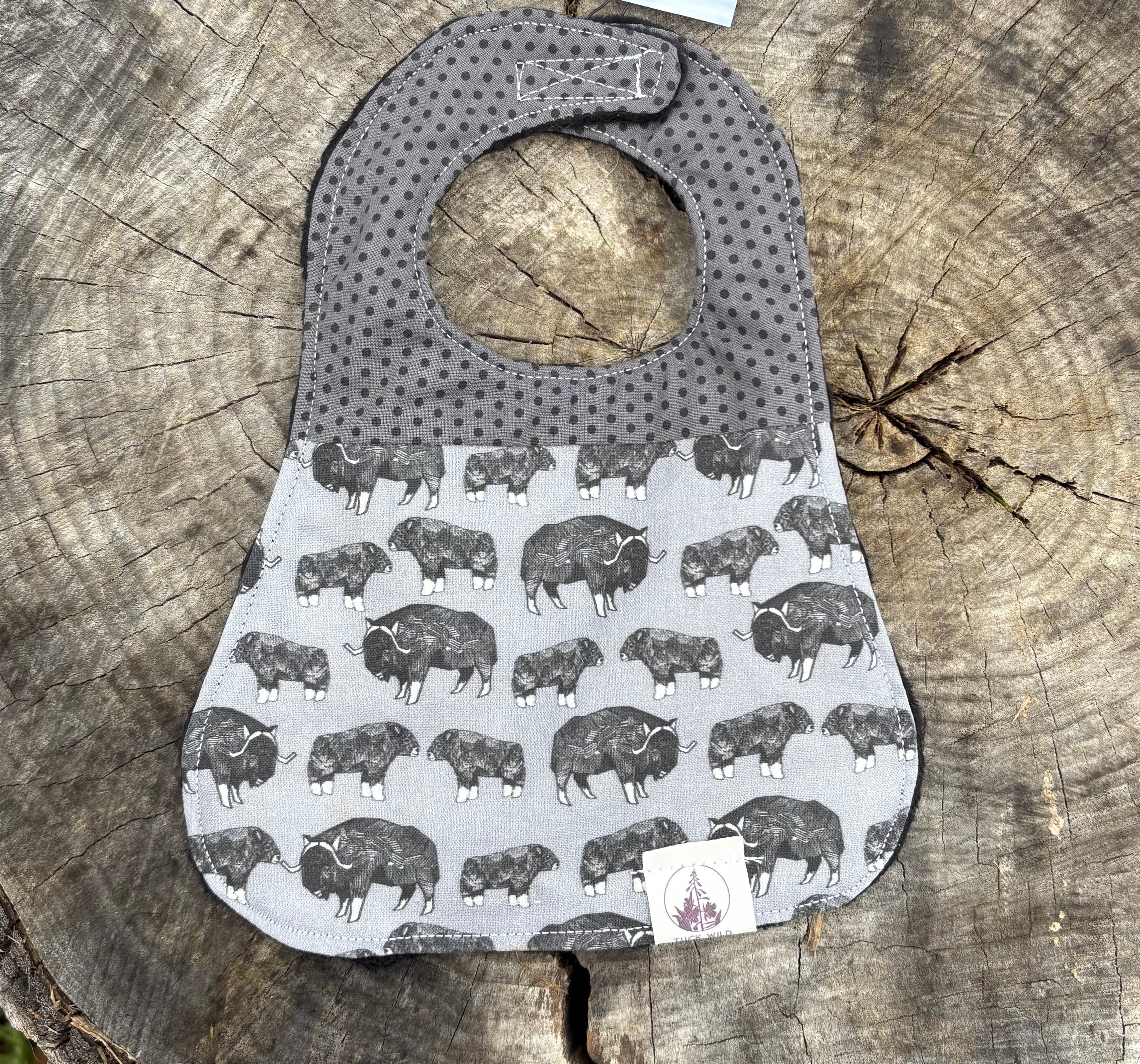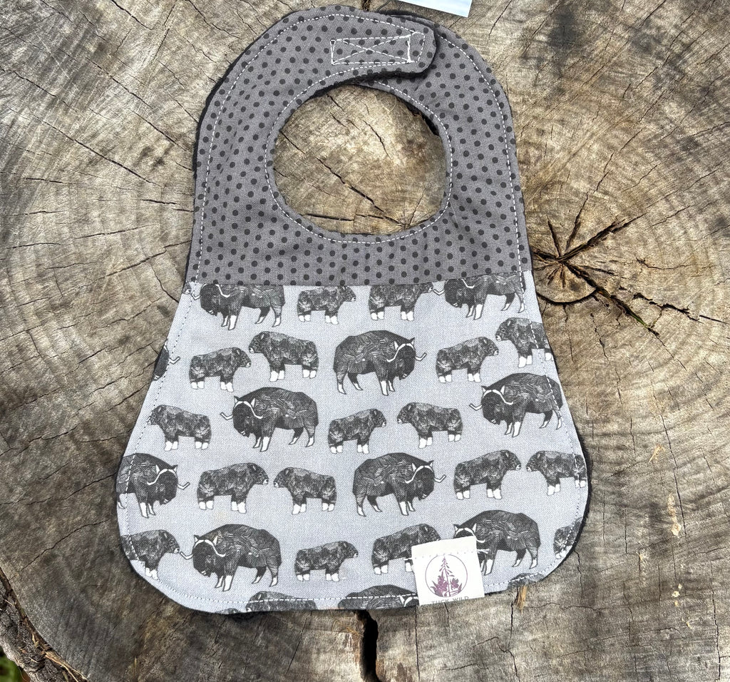 These three layer baby bibs are made in Alaska by Tuck Wild. They are three layers for oxtra absorbency and machine washable for easy clean up. The neck clasp is velcro for an adjustable fit.