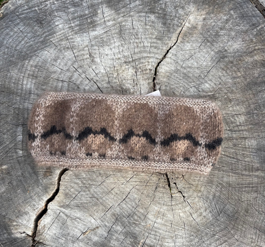 Hand Knitted by Ruth, in Ruth's own design, inspired by the musk ox as they build a circle when threatened to fend off predators. This headband is sold ox-clusively at the Musk Ox Farm in Palmer, AK.