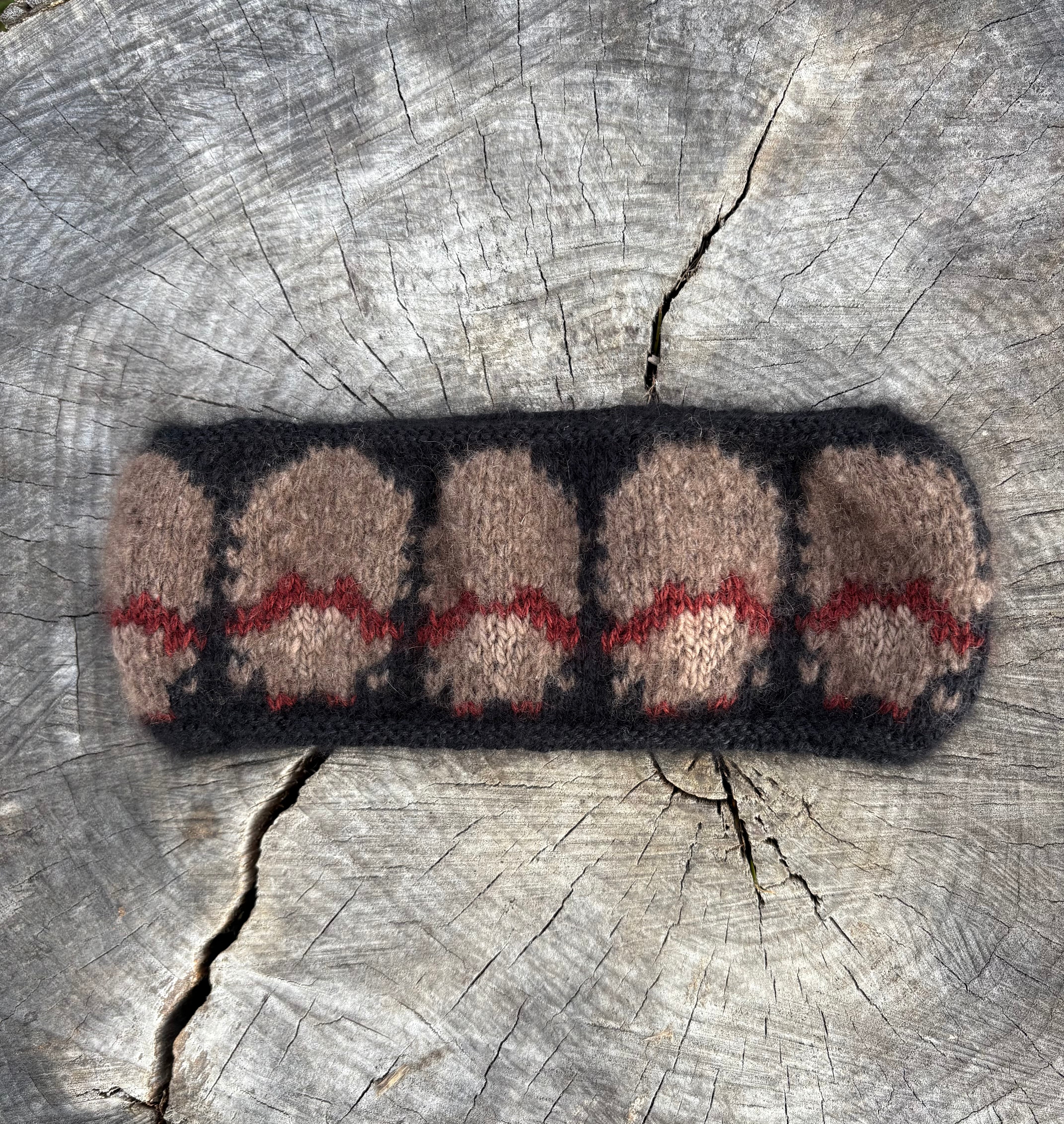 Hand Knitted by Ruth, in Ruth's own design, inspired by the musk ox as they build a circle when threatened to fend off predators. This headband is sold ox-clusively at the Musk Ox Farm in Palmer, AK.